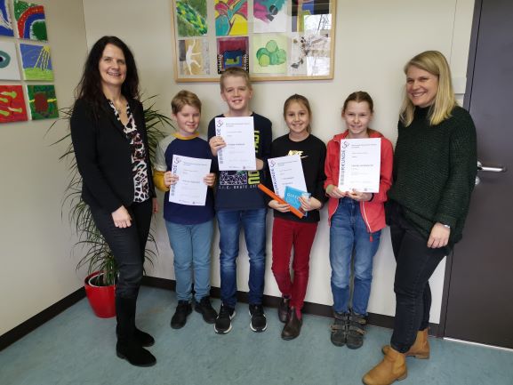 Drei von ihnen – je ein Schüler der 5. und 6. Klasse und eine Schülerin der 6. Klasse - hoffen nun darauf, sich für das hessische Finale zu qualifizieren. Sie erreichten in den Klausuren so viele Punkte, dass sie zur Zweitkorrektur vom Veranstalter angefordert wurden. Hoffentlich hat Frau Dieleman streng genug bewertet, denn dann haben die drei Kinder sehr gute Chancen zu den Allerbesten des Bundeslandes zu gehören.