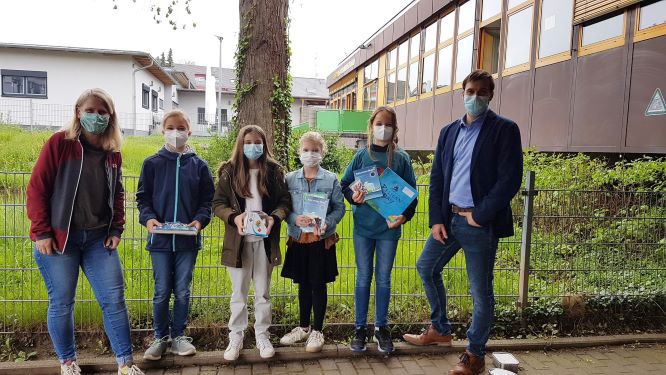 Die Siegerehrung musste aufgrund des Wechselunterrichts auf zwei Tage verteilt werden. Am Montag, den 10. Mai, gratulierte unsere Schulleiterin Frau Braun den Preisträgerinnen und Preisträgern auf dem Schulhof. Am Dienstag übergab Herr Benz für den Gymnasialzweig die Urkunden und Preise.
